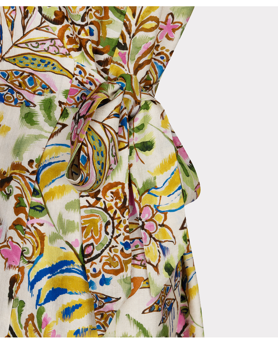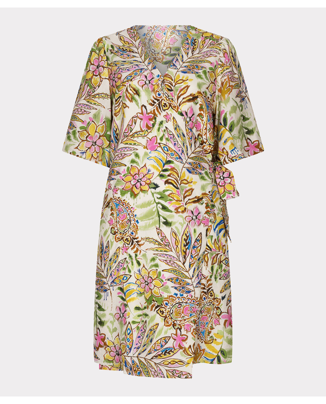 Deze kleurrijke wikkeljurk met jungle- en paisleyprint is een echte blikvanger voor zonnige dagen. De soepele stof, strikceintuur en V-hals maken ‘m perfect voor een lunch op het terras of een zomers feest.