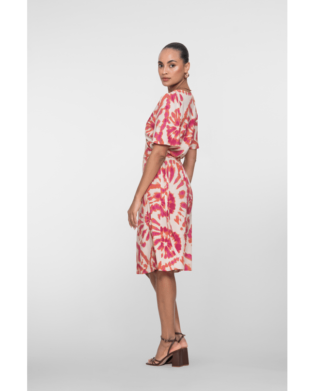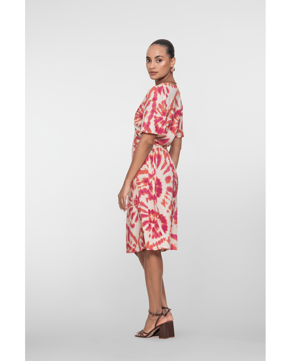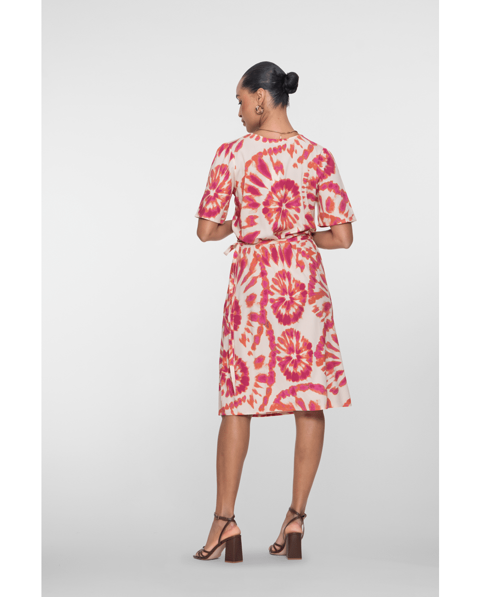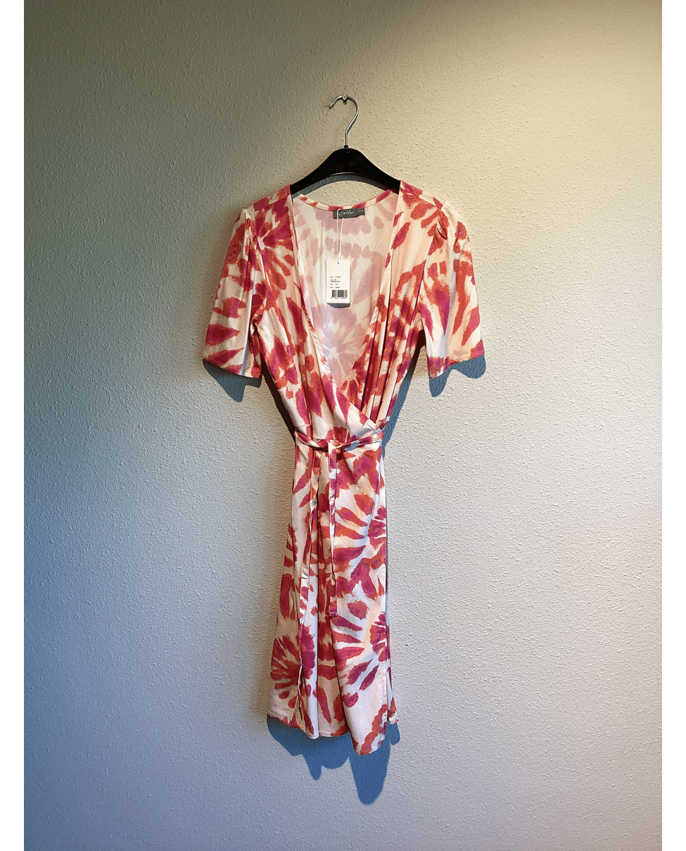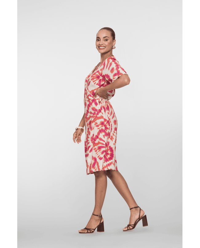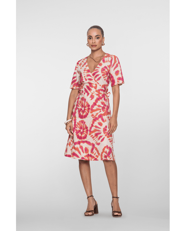 Deze oranje/roze dames jurk van Geisha is een echte zomerfavoriet. De levendige print in combinatie met de vrouwelijke overslag en strikceintuur zorgt voor een speelse, flatterende look. Perfect voor een zonnige dag, een etentje of vakantie.