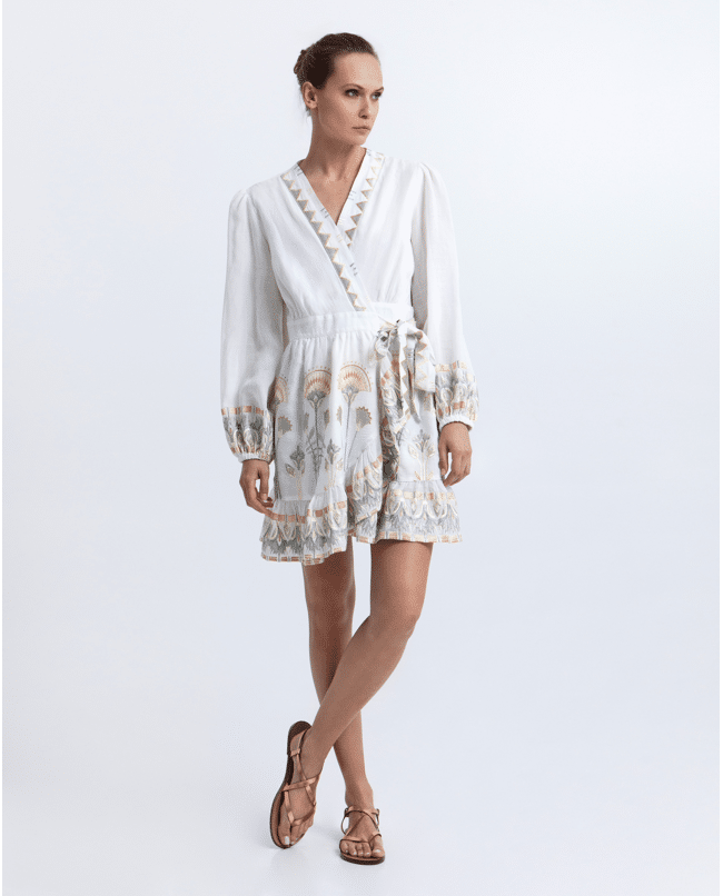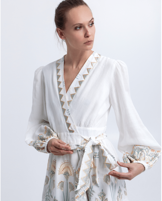 De combinatie van wit met zachte mint- en goudaccenten geeft een fris en stijlvol gevoel. De wikkelvorm flatteert elk figuur op een subtiele manier.