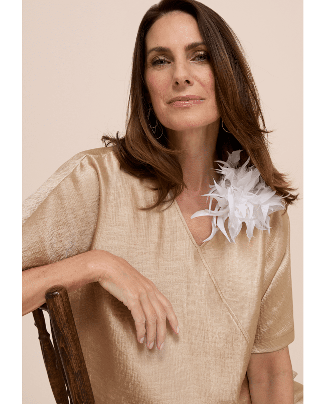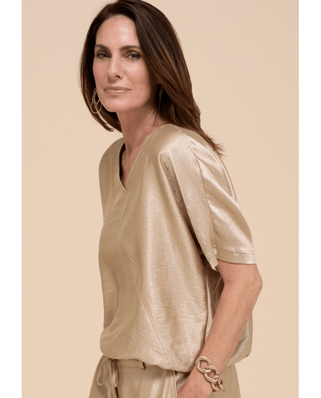De subtiele glans geeft de top een verfijnde uitstraling, terwijl de V-hals en elastische zoom zorgen voor een flatterend silhouet.