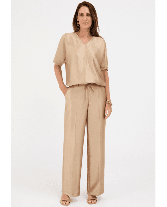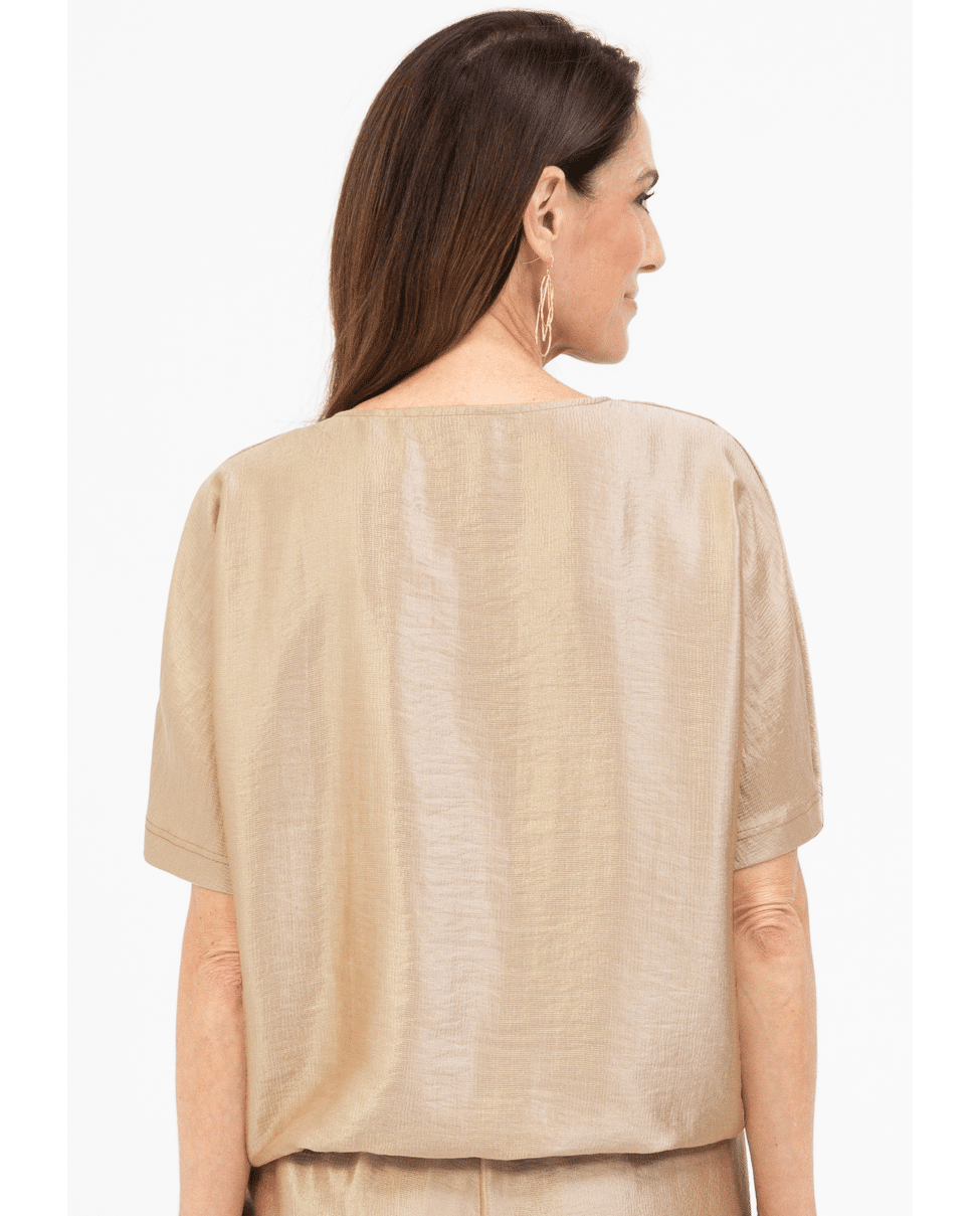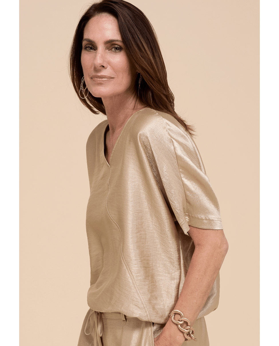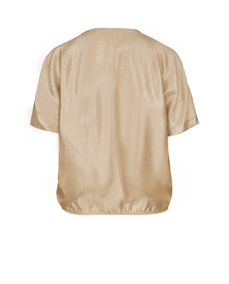 Deze glanzende blousetop brengt elegantie en comfort moeiteloos samen. Dankzij de elastische zoom en soepele stof is dit een ideaal item voor zowel een casual als chique zomerdag.