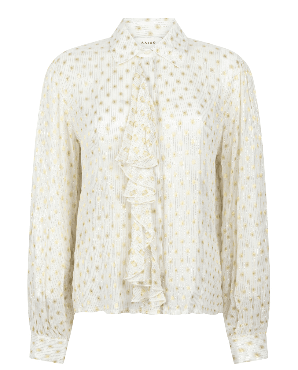 Deze semi-transparante blouse Yalise is afgewerkt met een subtiel gouden dot-patroon en verticale lurexstrepen. De speelse ruffle aan de voorkant springt in het oog, en de mouwen zijn licht geplooid.
