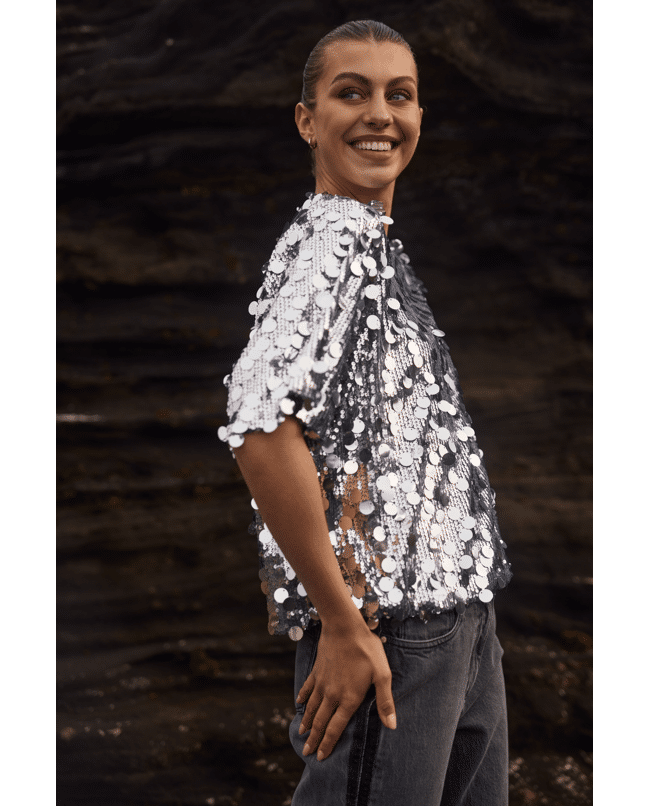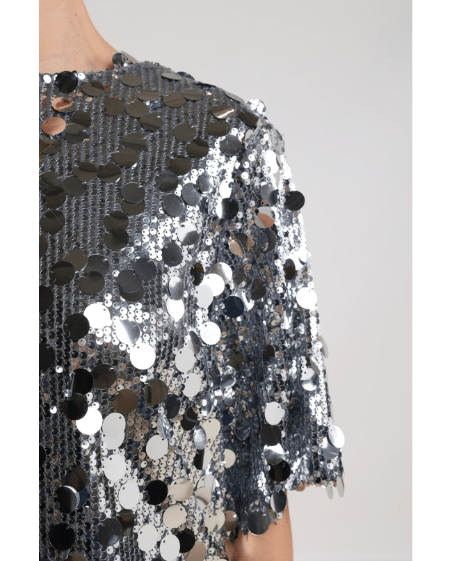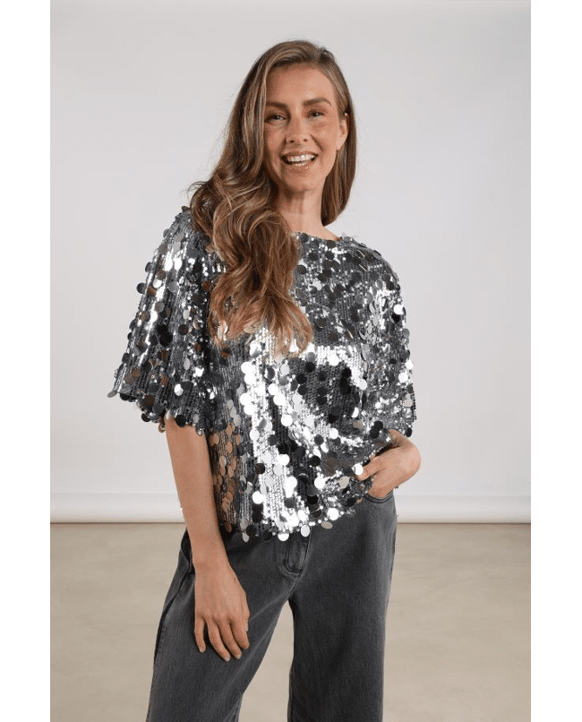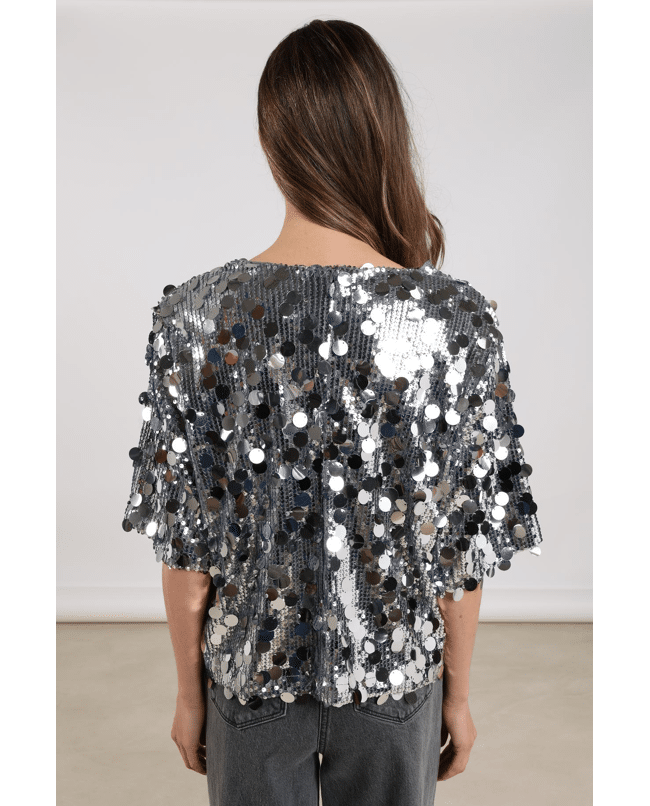 De Yara Top Paillet in zilver is een echte eyecatcher voor feestelijke gelegenheden. Het glanzende paillettenontwerp geeft je look direct een glamoureuze uitstraling.