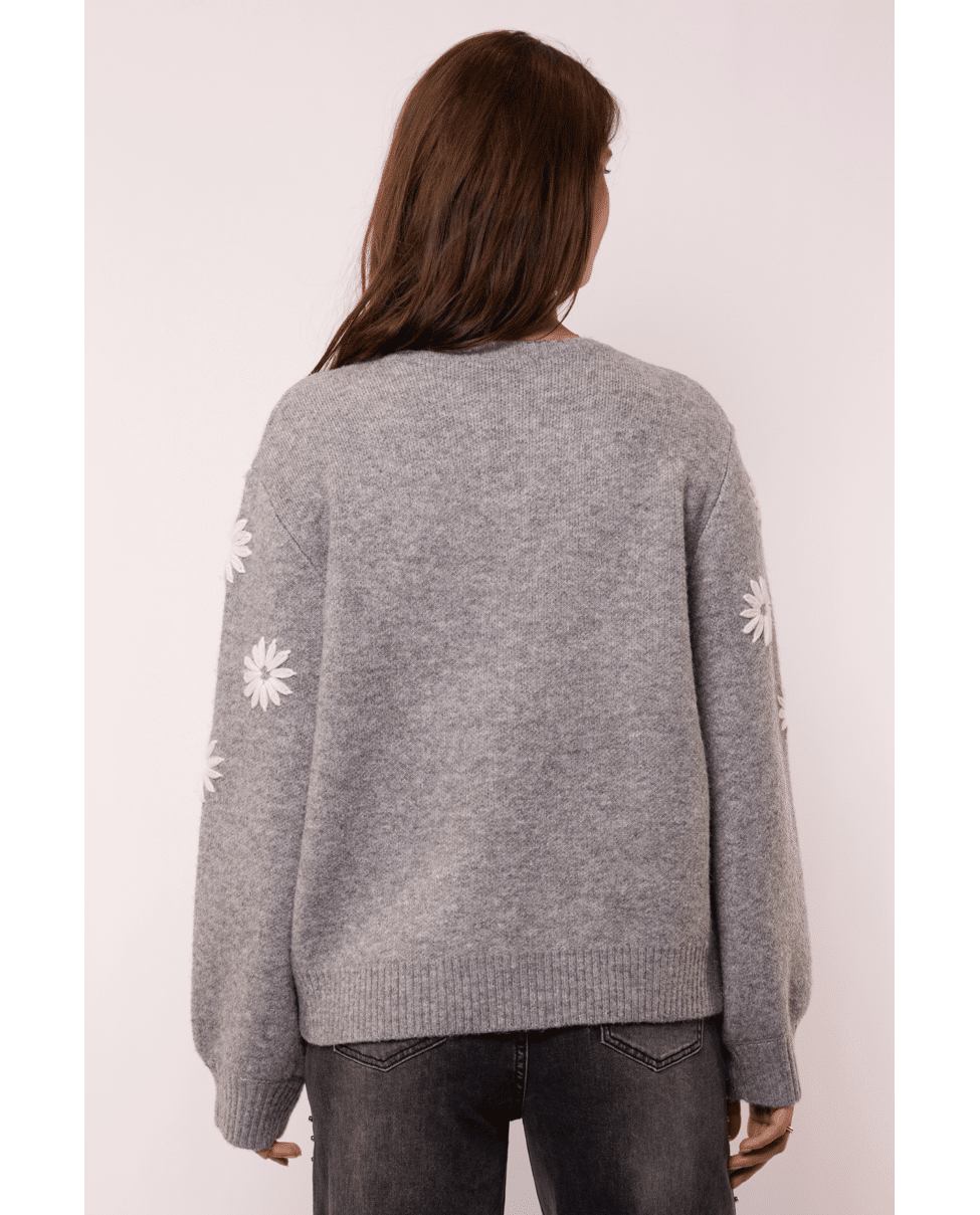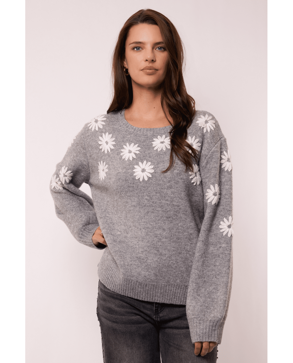 Zaina knitting sweater – Gebreide damestrui van G-maxx met witte geborduurde bloemen, ronde hals en lange mouwen
