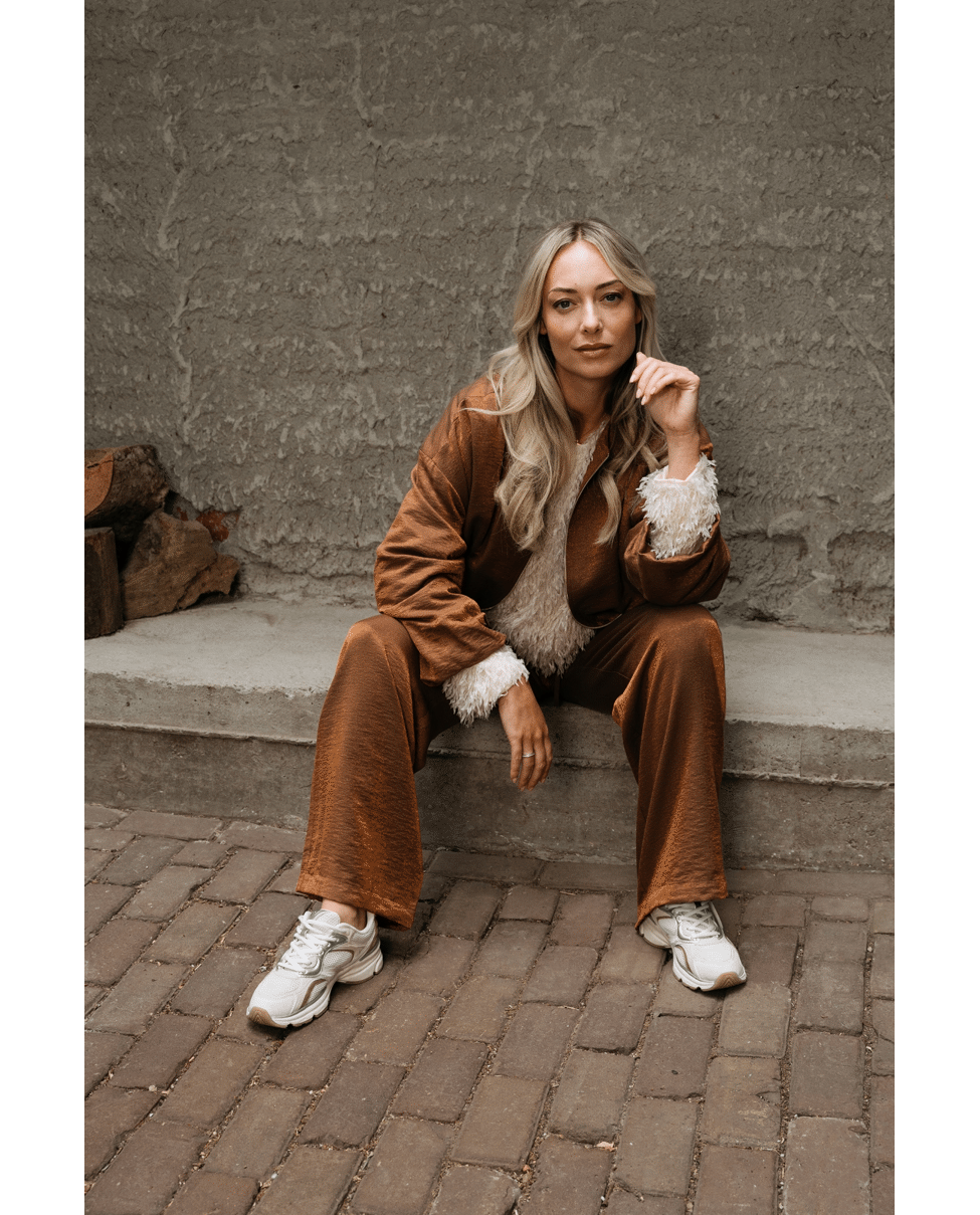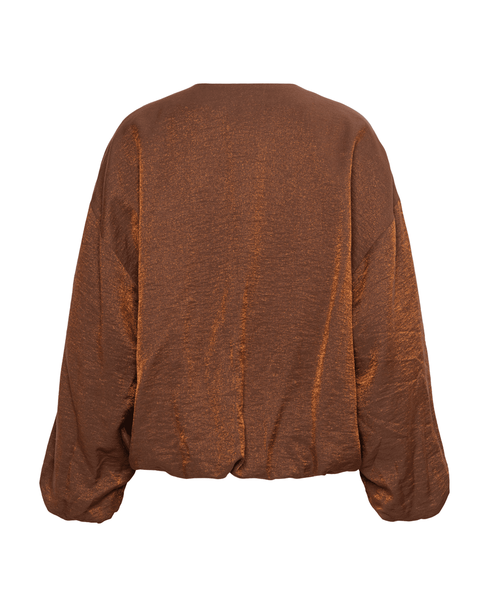 Dit gevoerde jasje in koperkleur heeft een verfijnde, vrouwelijke uitstraling. Perfect voor feestelijke gelegenheden of een stijlvolle avondlook.