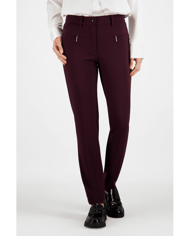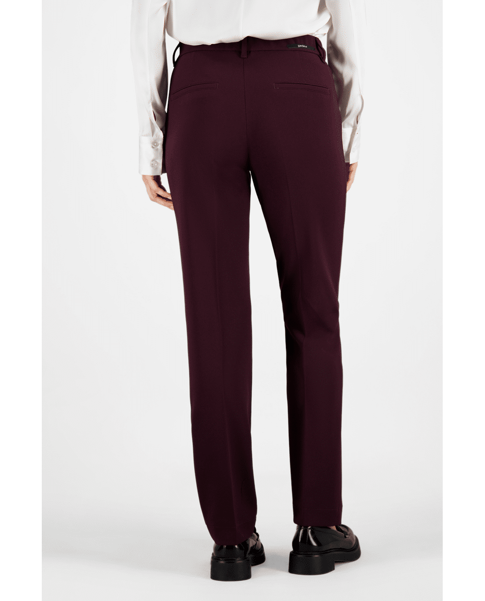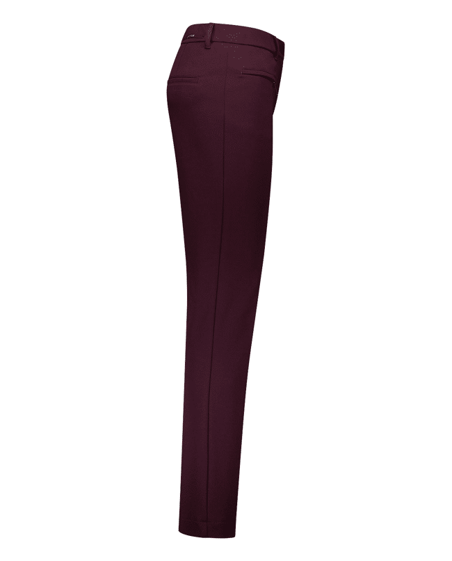 Een stijlvolle broek met een moderne, vrouwelijke pasvorm. De diepe bordeauxkleur en het slanke silhouet geven deze broek een chique uitstraling, ideaal voor zowel kantoor als casual gelegenheden.