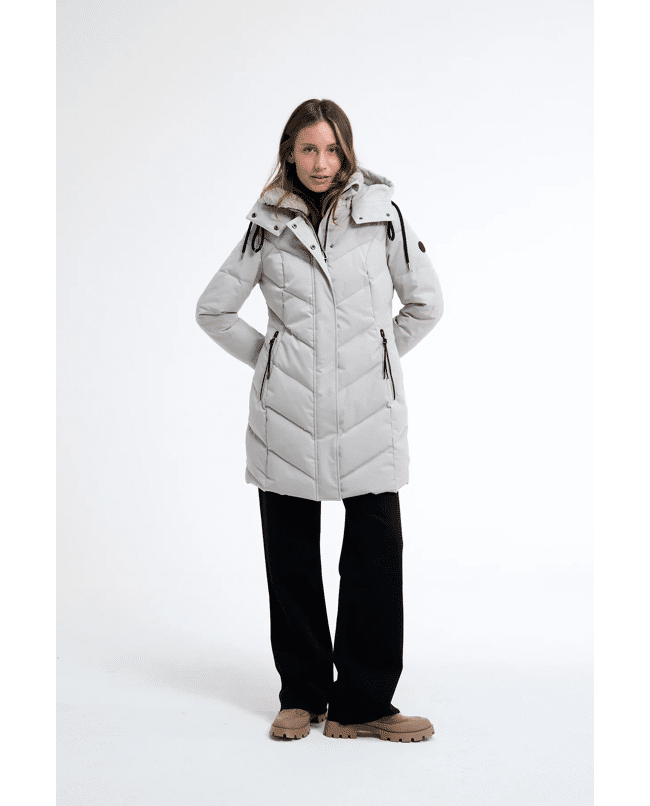 Deze damesjas is ontworpen voor gure dagen waarop je niet wilt inleveren op comfort of stijl. De lengte, capuchon en waterafstotende stof bieden optimale bescherming.