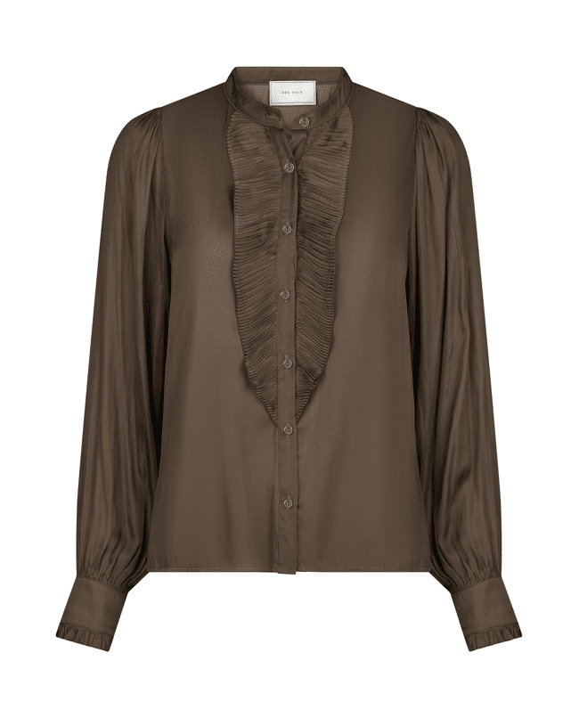Deze blouse van zachte satijnkwaliteit straalt verfijning uit, met speelse ruches langs de sluiting. Losvallend en vrouwelijk – ideaal voor kantoor of een dinerdate.