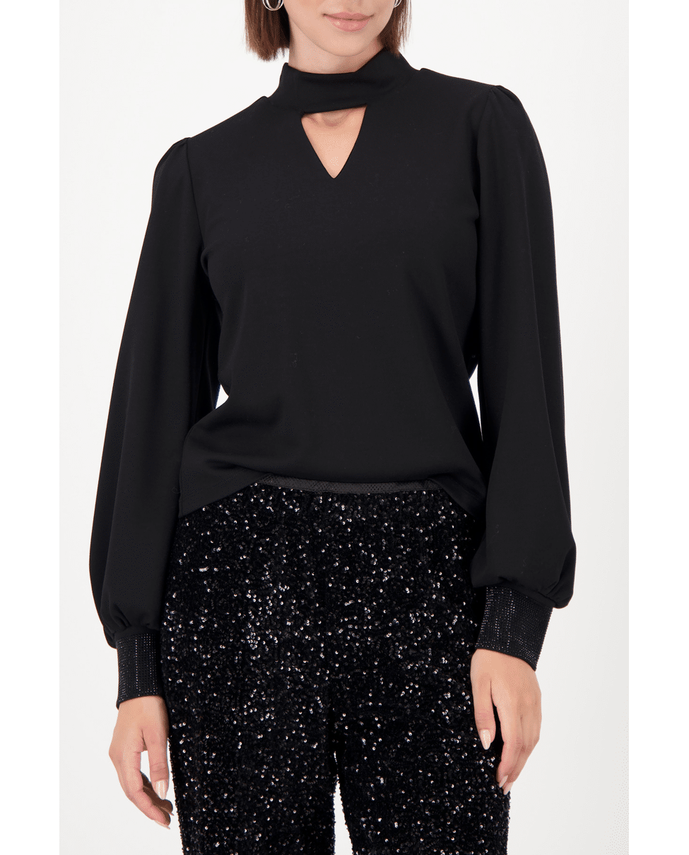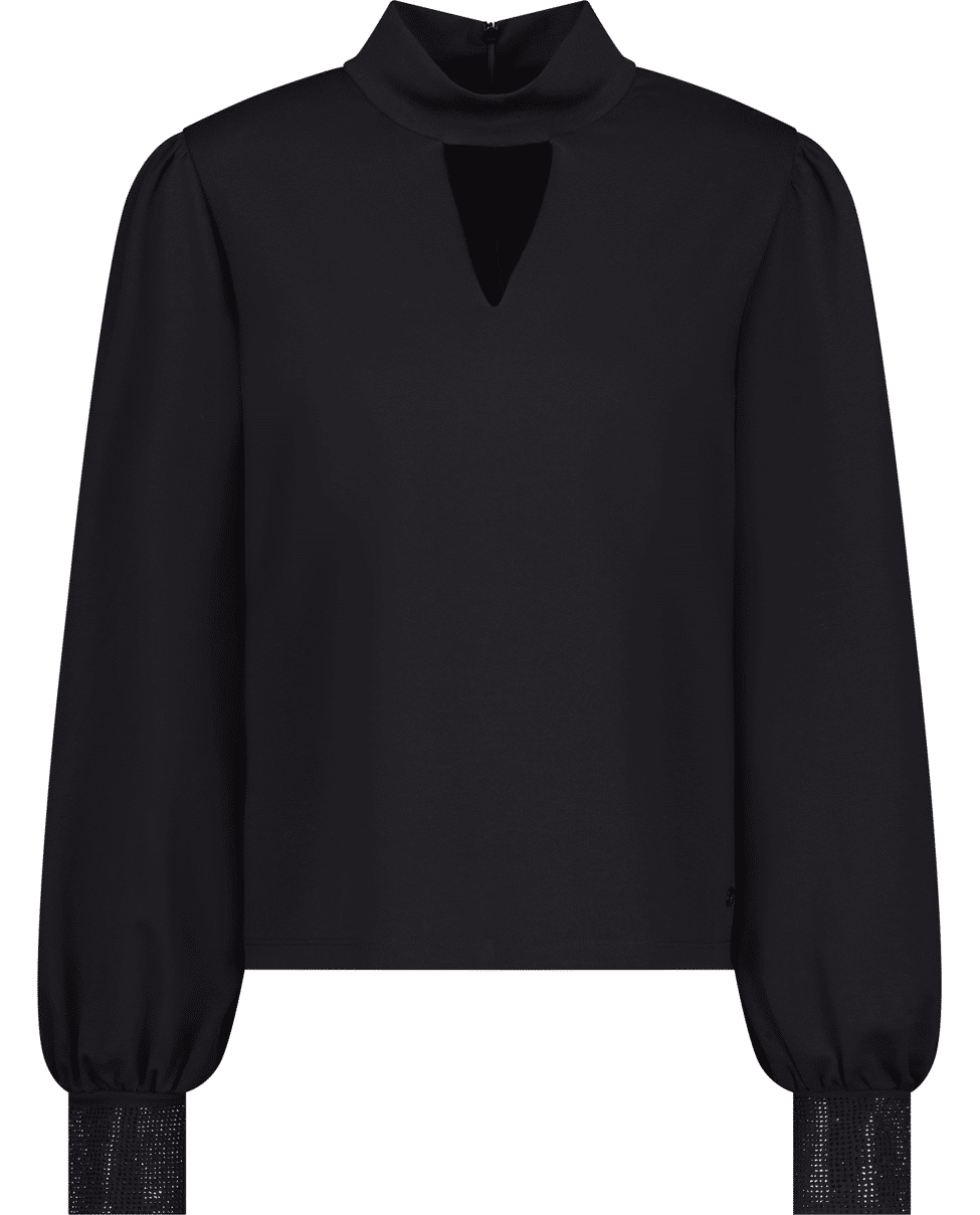 Zwart sweatshirt met lange mouwen, keyhole-hals en subtiele strassdetails. Een verfijnde keuze voor feestelijke momenten of een avond uit.