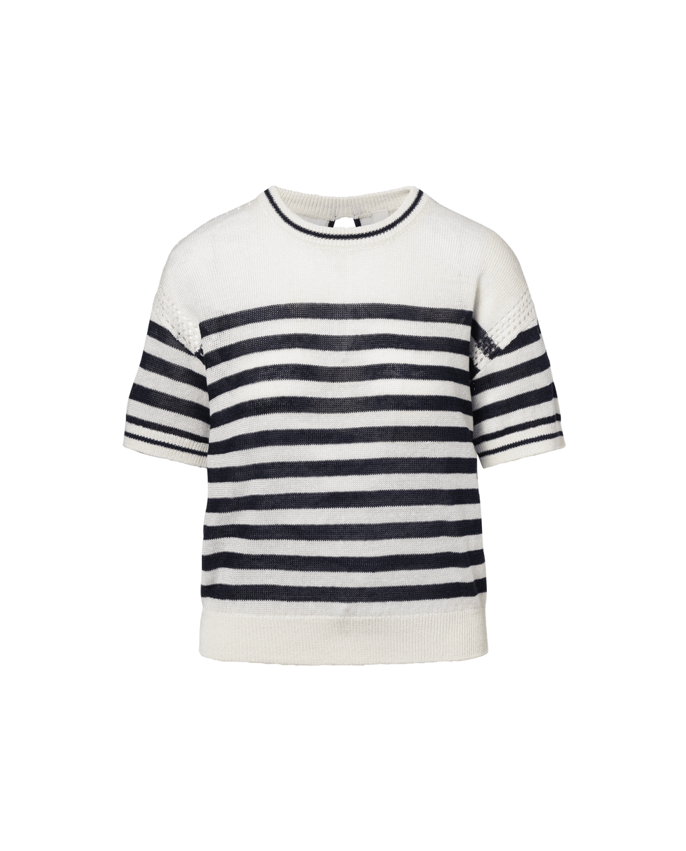 De combinatie van het klassieke streeppatroon en de subtiele open steek bij de schouders geeft deze pullover een verfijnde, zomerse uitstraling. Het kleine splitje op de rug zorgt voor een verrassend detail.