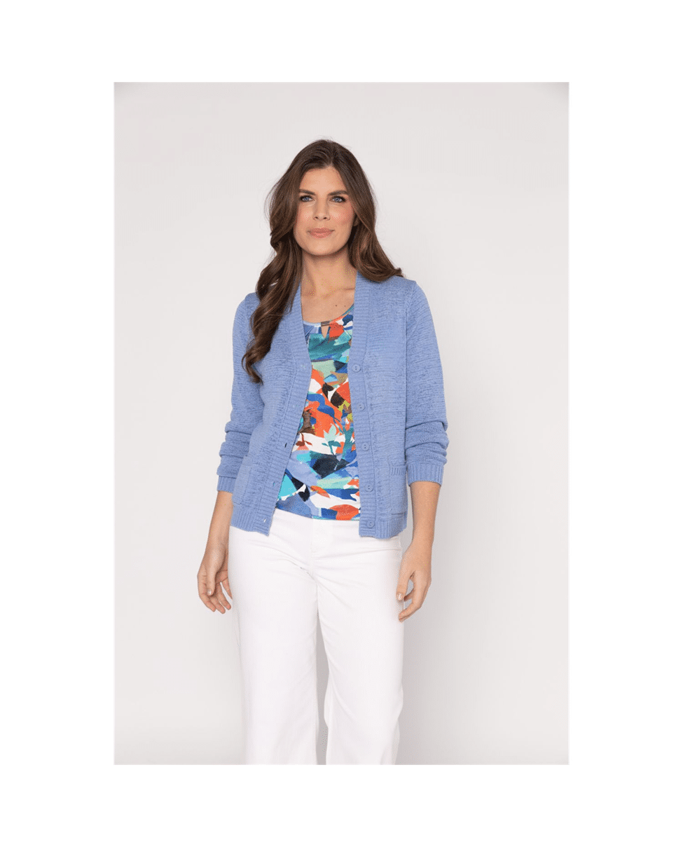 Dit dames vest met V-hals in frisse sky blue is een ideaal voorjaarsvest. Dankzij het katoenmix bandjesgaren draagt het luchtig en comfortabel – perfect als extra laagje op een koele lentedag.